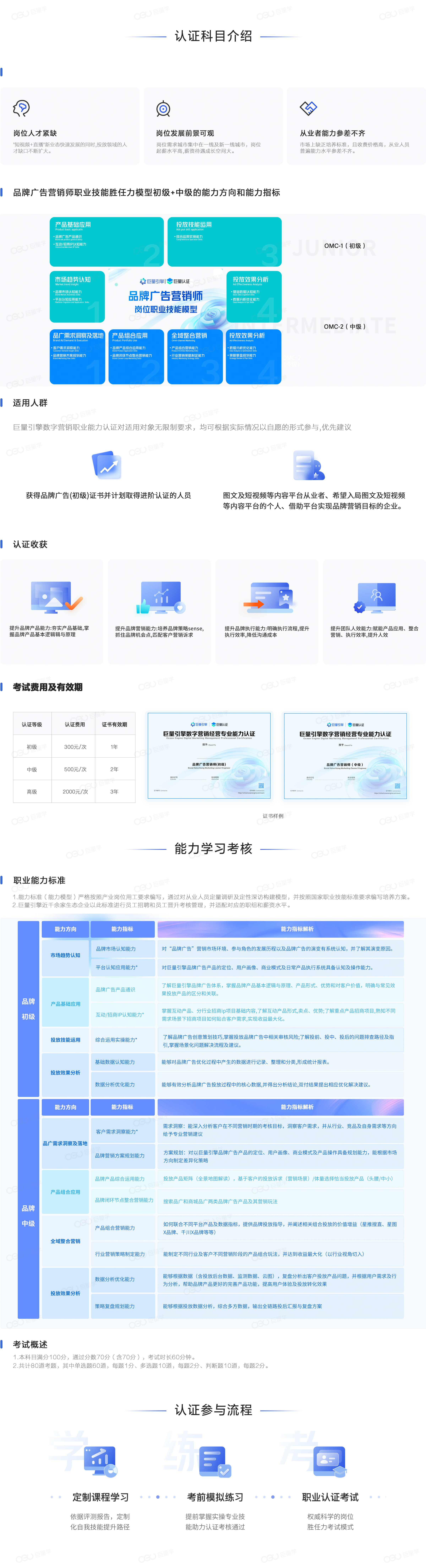 主要针对获得品牌广告(中级)证书并计划取得进阶认证的人员,适用于从事品牌广告投放、媒介、策划、创意、销售等相关工作的岗位。